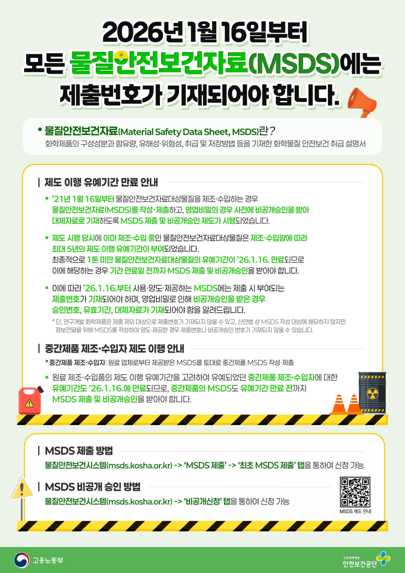 2026.1.16. 이후에는 모든 물질안전보건자료(MSDS)에 제출번호가 기재되어야 합니다.