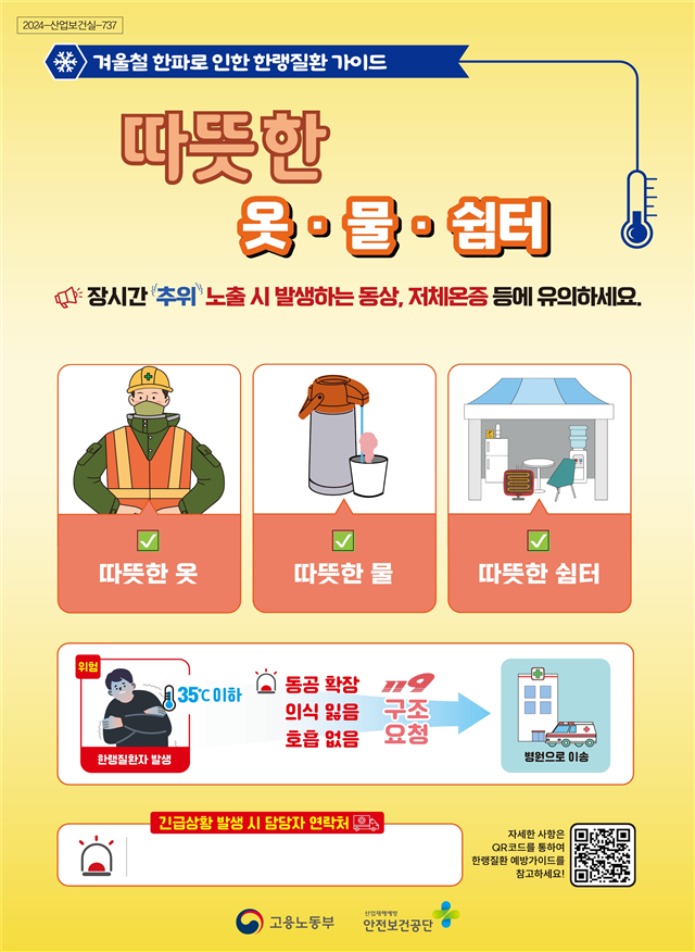 이와 함께, 겨울철 한파에 장시간 노출되면 저체온증, 동상 같은 한랭질환, 뇌심혈관질환 등이 발생할 수 있으므로 한랭질환 3대 기본수칙*을 안내하고, 기저질환자(고혈압, 당뇨 등), 고령자 등에 대해서는 세심한 관리를 하도록 지도한다.